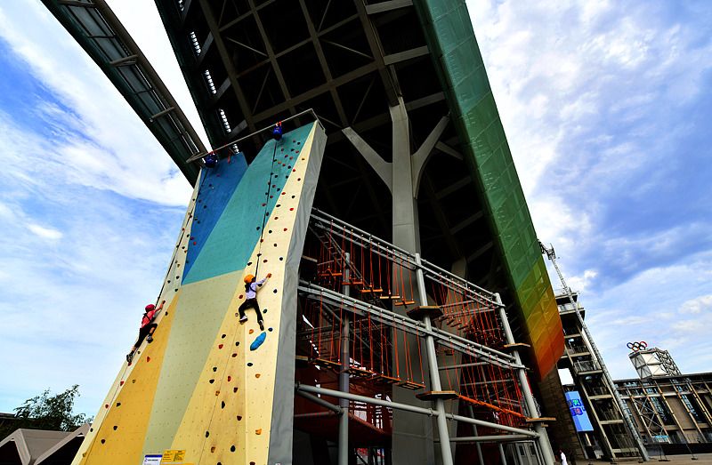 2025年6月7日,北京石景山,首钢园滑雪大跳台下方设置的“攀岩”吸引孩子们体验。