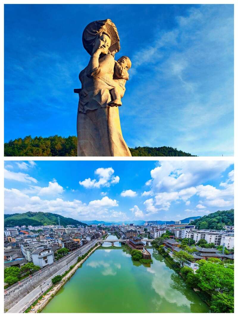 头戴凉笠、手持竹篙。夏日汀江畔,一尊高达20余米的客家母亲雕像在阳光下挺拔伫立。