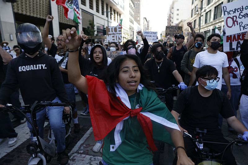 当地时间2025年6月10日,美国加利福尼亚州洛杉矶,抗议者在市中心游行。