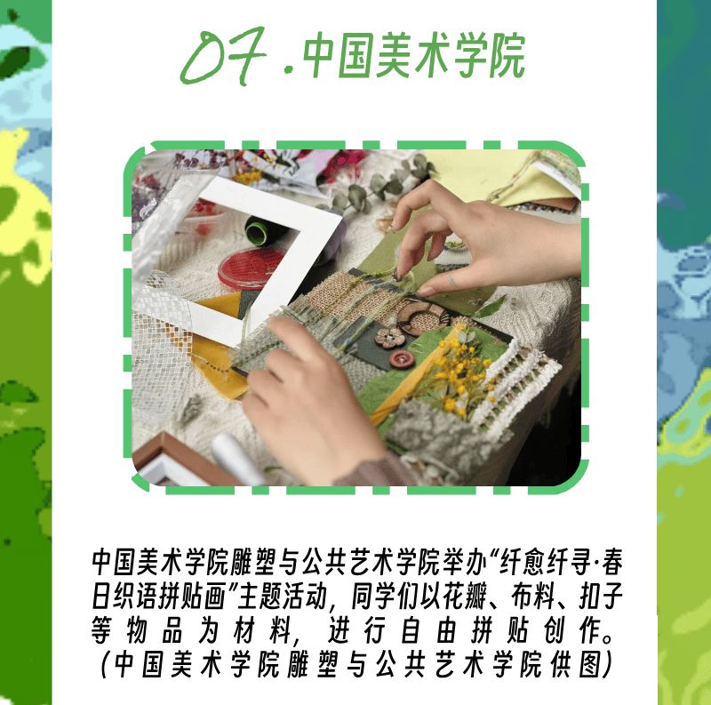 以自然花瓣、布艺纹样为媒,中国美术学院雕塑与公共艺术学院举办“纤愈纤寻·春日织语”拼贴画主题活动,鼓励大学生通过自由拼贴创作唤醒内心生命力。在春日暖阳下,他们用色彩与纹理舒展情绪,让碎片化灵感重组为独属的治愈图景。同时通过自我对话环节让创作成为倾听内心的镜子,释放压力、觉察情绪,在指尖艺术中重拾对生活的注视。
