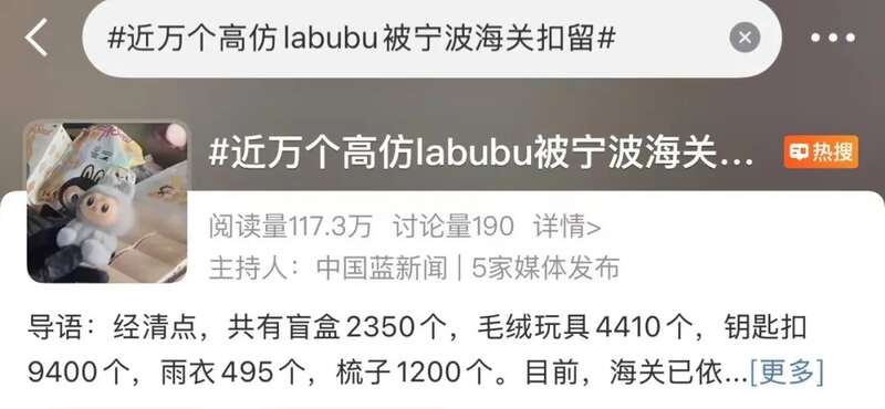 无独有偶,不久前,宁波海关也扣留了一批涉嫌侵犯“LABUBU”版权的货物,数量近20万个。