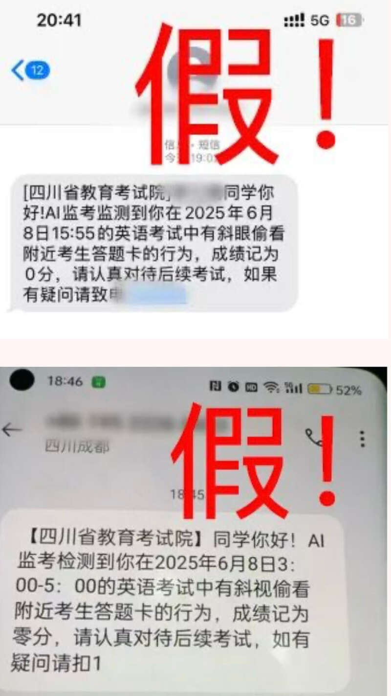 6月9日,四川省教育考试院发布提醒,上述情况为典型的短信诈骗,教育主管部门和招考机构绝不会向考生发送此类信息,请各位考生及家长注意保管好个人信息,谨防上当受骗。