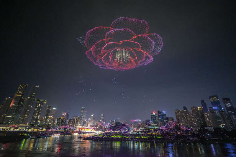 6月17日,在重庆地标朝天门,长江和嘉陵江交汇处,11787架无人机翩然起舞。夜空中,一朵巨型的重庆市花山茶花,层叠舒展,片片花瓣散落江面。