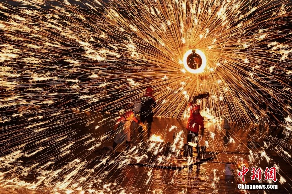 6月20日,在北京平谷梨树沟休闲谷景区,工作人员表演非遗打铁花项目。中新社记者 张祥毅 摄