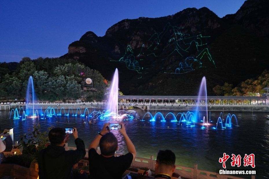 6月20日,在北京平谷梨树沟休闲谷景区,山顶水舞秀吸引游客。中新社记者 张祥毅 摄
