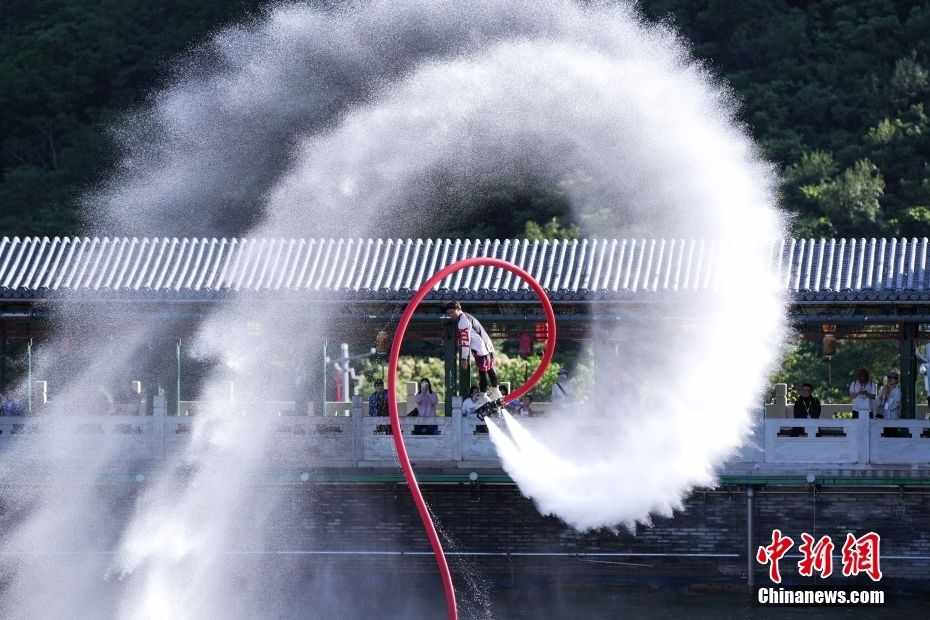 6月20日,在北京平谷梨树沟休闲谷景区,水上飞人表演吸引游客。中新社记者 张祥毅 摄