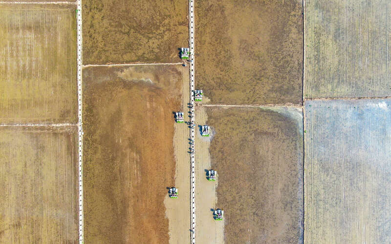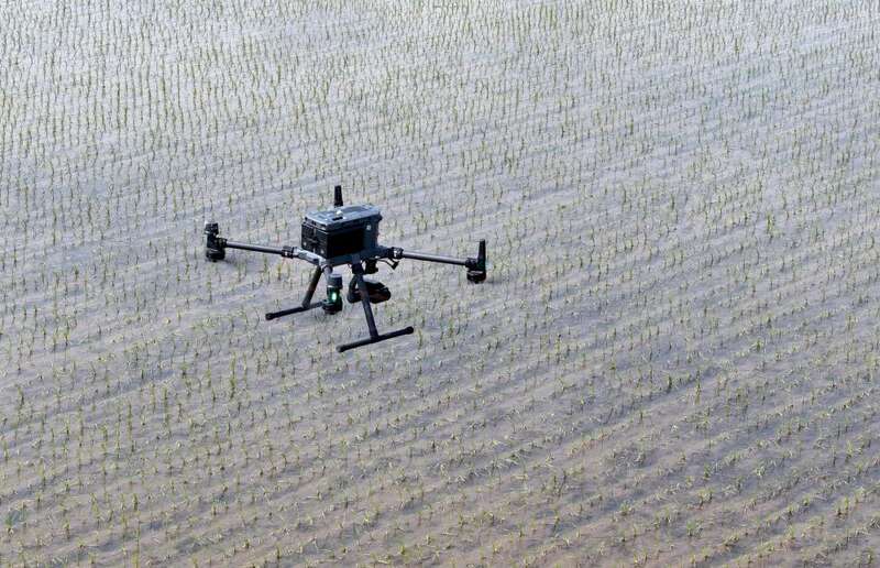 2025年5月21日,在黑龙江省北大荒农业股份八五六分公司第六管理区农业现代化示范区,搭载多光谱、可见光摄像头的无人机对水稻插秧后田块进行土壤墒情监测(无人机照片)。