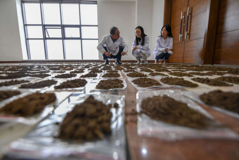2022年5月23日,在黑龙江省海伦市前进镇光荣村,黑龙江省农业科学院科研人员在进行坡面生态修复的黑土坡耕地中查看治理情况。