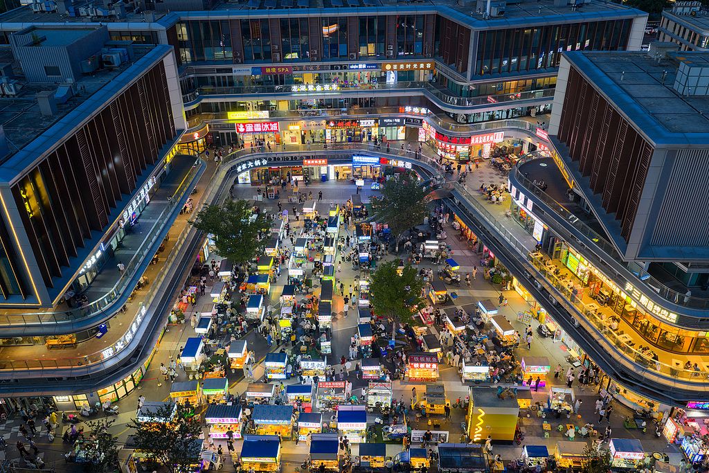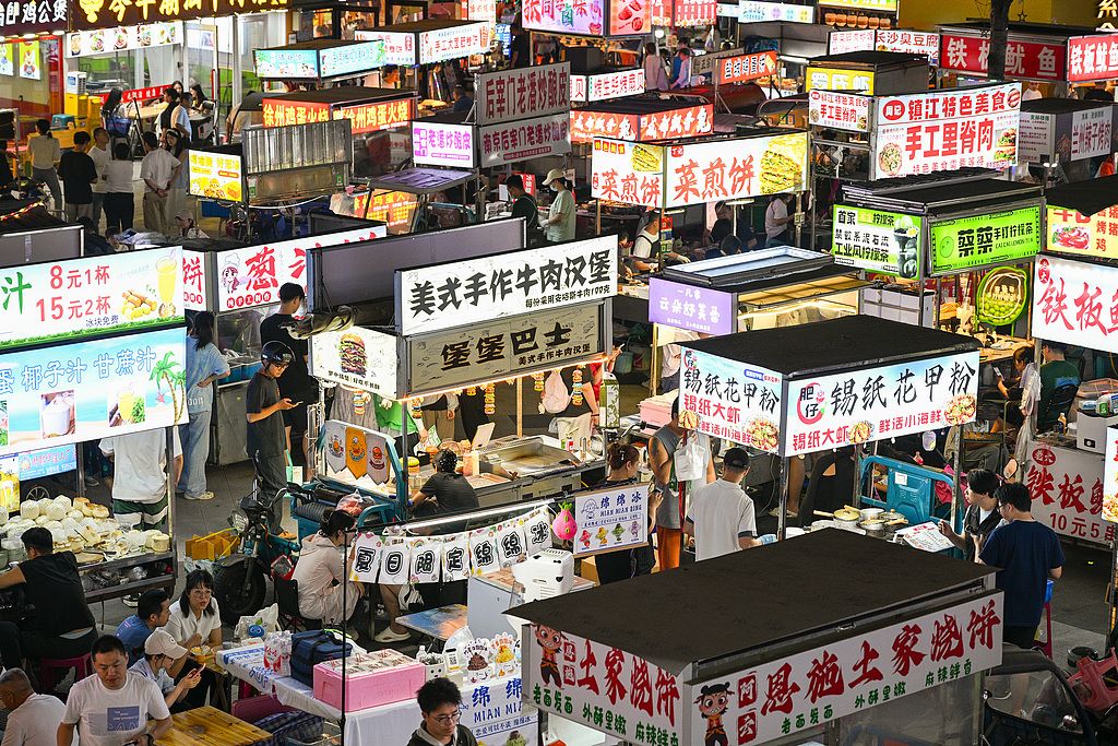 2025年6月24日,江苏省南京市玄武区,龙湖紫金夜市灯火通明,市民和游客在夜市中纳凉、休闲、购物,品尝特色美食。