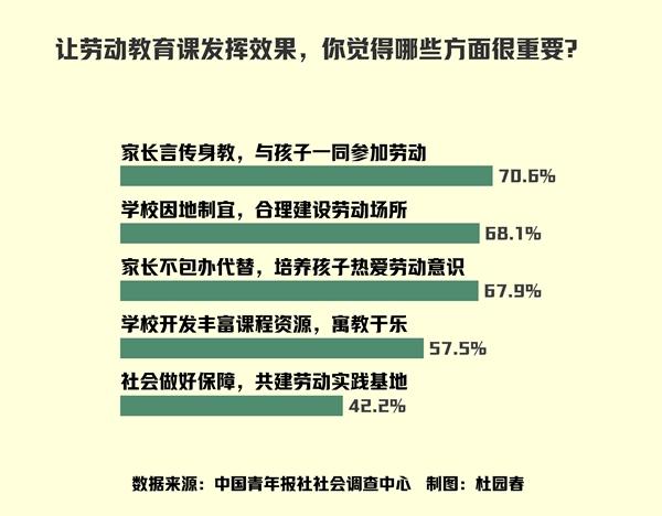 前不久,中国青年报社社会调查中心联合问卷网(wenjuan.com),对1603名中小学生家长进行的一项调查显示,让劳动教育课真正发挥效果,70.6%的受访家长认为家长要言传身教,与孩子一同参加劳动;68.1%的受访家长希望学校因地制宜,合理建设劳动场所。
