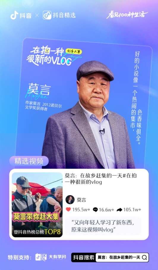 不同身份、不同领域的创作者为该大赛“代言”,比如,作家莫言就以“文化纪实+生活记录”,带来一支“生活散文vlog”。