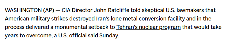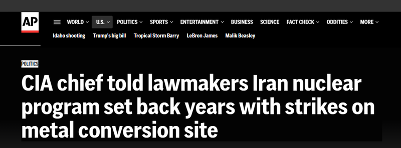 美国中央情报局局长约翰·拉特克利夫上周在国会出席闭门听证会。《华盛顿邮报》和美联社6月29日分别援引美国官员的话报道,拉特克利夫说,伊朗核计划多座关键设施被完全摧毁,包括唯一的“金属转化”设施。这一设施位于伊斯法罕核设施内,用于把浓缩铀气体转化成金属,对制造核武器的爆炸核心至关重要。按照拉特克利夫的说法,伊朗需要数年才能重建这一设施。