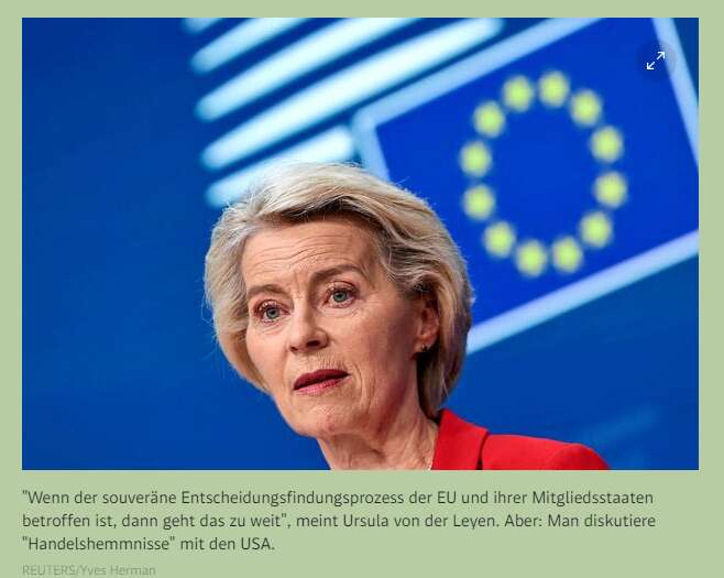 据德国《焦点》杂志报道,欧盟委员会主席冯德莱恩日前出人意料地向美国企业承诺,后者将在欧盟《数字市场法案》实施过程中拥有发言权。此举被认为意在“安抚特朗普”。