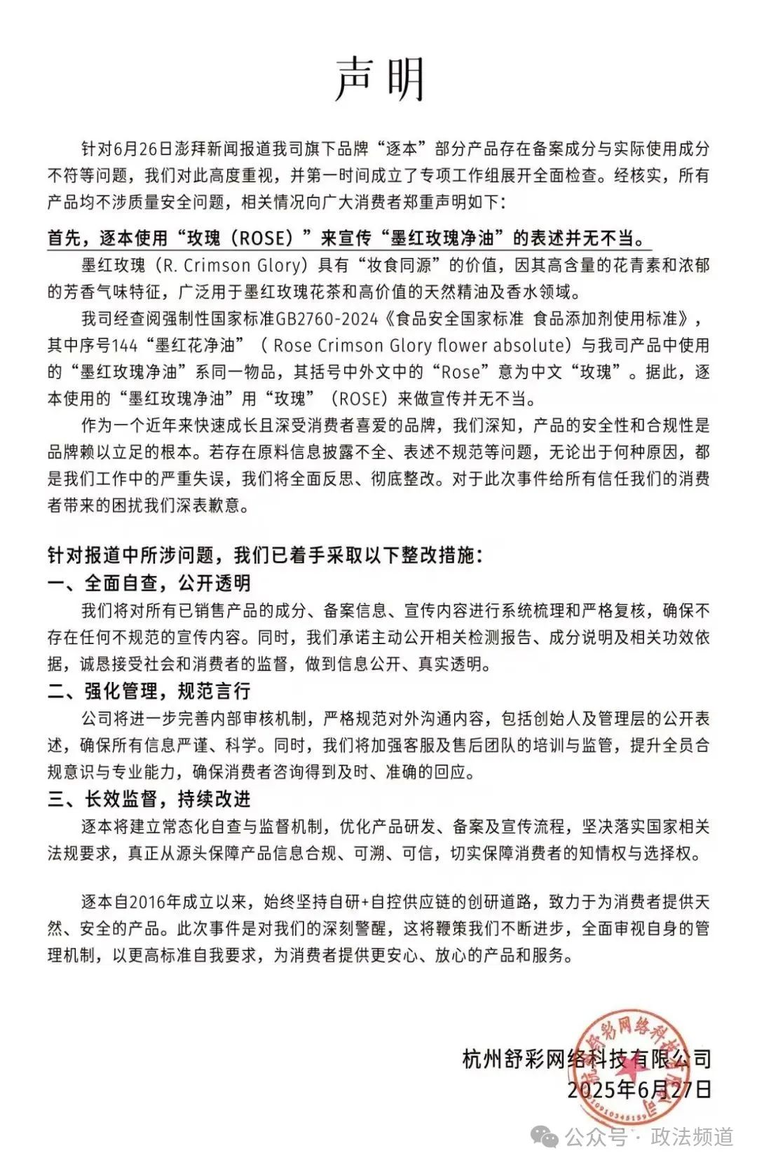 6月27日,逐本母公司杭州舒彩网络科技有限公司发布声明,强调“所有产品均不涉及质量安全问题”。针对核心争议,该公司解释称,其产品使用“玫瑰(ROSE)”来宣传“墨红玫瑰净油”的表述并无不当。逐本表示,在国标文件中,序号144“墨红花净油”与其产品中使用的墨红玫瑰净油系同一物品,逐本使用的“墨红玫瑰净油”用“玫瑰”来做宣传并无不当。