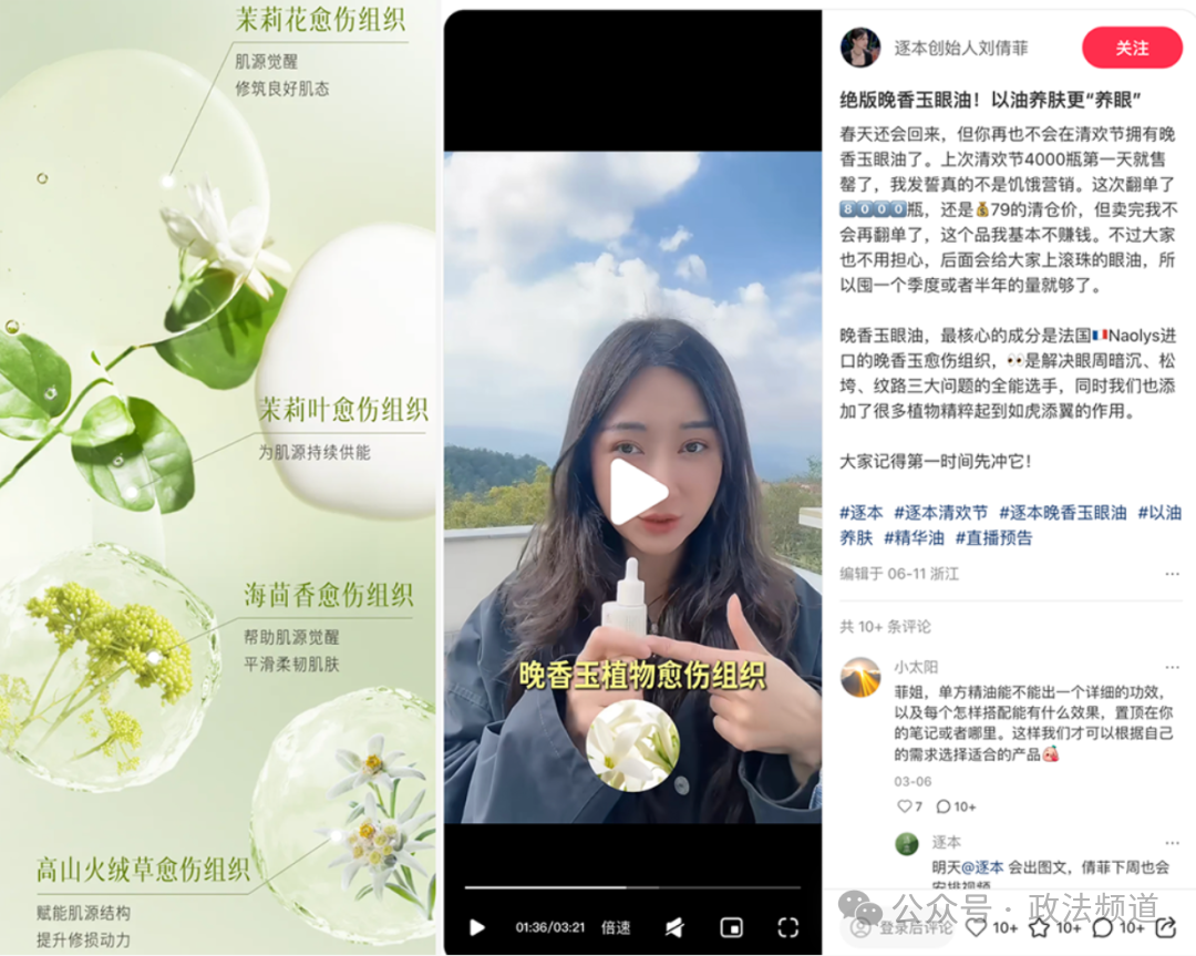 6月25日,该品牌创始人刘倩菲在小红书直播中讲解多款“逐本香养”系列单方精(净)油产品时,宣称产品可“长小毛毛(育发)”“调节月经不规律”“化痰止咳、抗病毒”。被质疑其对普通化妆品宣传中暗示医疗作用。