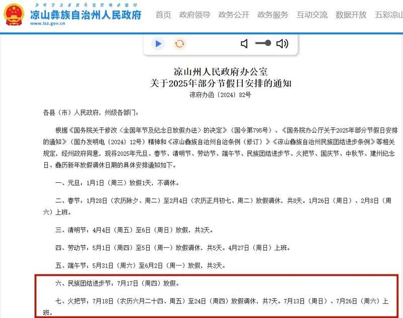 除国家的法定假日外,凉山州还多了“民族团结进步节”“火把节”“州庆”“彝历新年”四个节假日,共计比国家法定假日多休16天。