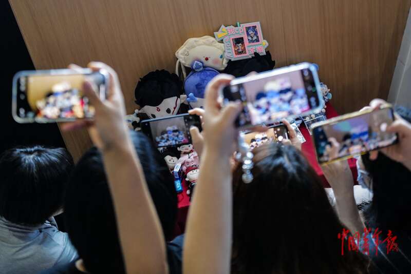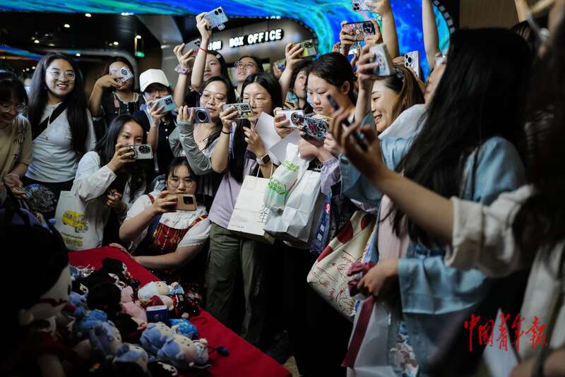 6月30日晚,北京市朝阳区一家电影院,看完该影院最后一场《哪吒之魔童闹海》的观众将随身携带的电影周边玩偶聚在一块拍照留念。中青报·中青网记者 赵迪/摄