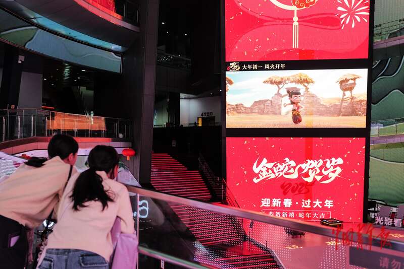 2月13日晚,中国电影博物馆,两名女孩在观看《哪吒之魔童闹海》宣传片。统计数据显示,该片上映首日票房就创下4.87亿元佳绩。中青报·中青网记者 赵迪/摄