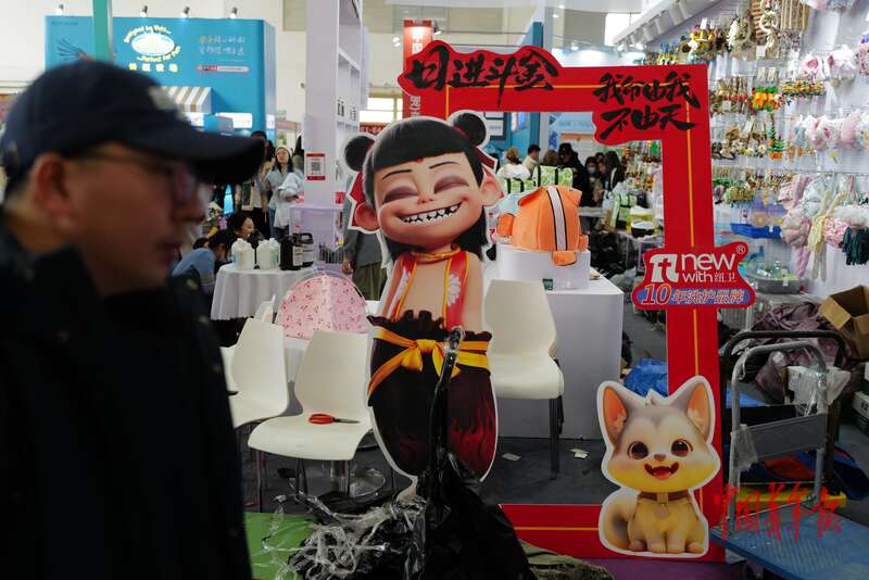 3月2日,北京中国国际展览中心(顺义馆),一场国际性展会的展板上印着大热动画电影里哪吒的形象。 中青报·中青网记者 赵迪/摄