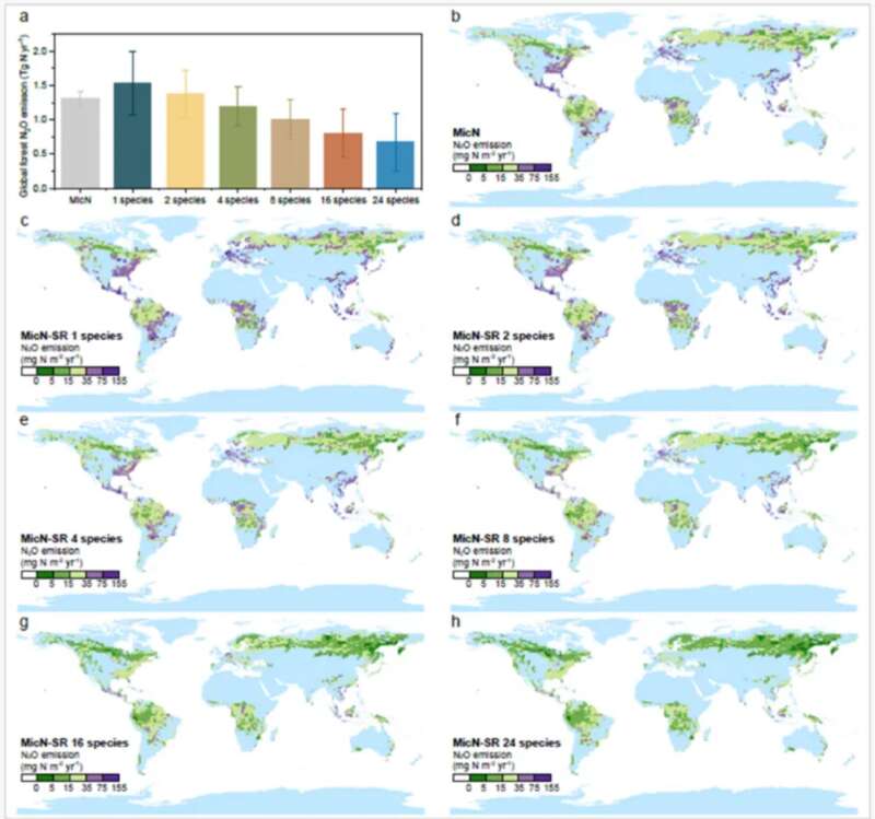 研究团队将植物多样性因子纳入N2O过程模型,构建植物多样性-土壤-N2O通量模型,量化不同树种多样性情景下的全球森林土壤N2O排放。模拟结果表明与单一树种相比,拥有2种树种的森林可以减少全球森林10.39%的N2O排放;拥有24种树种的森林减排效果最大,达56.30%。