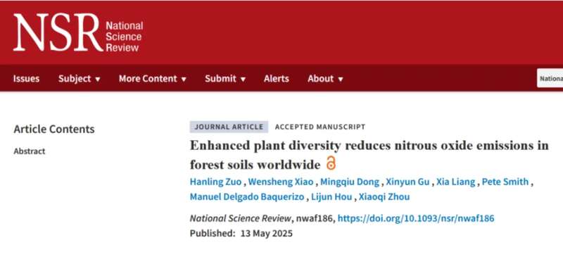 中国青年报客户端讯(中青报·中青网记者 王烨捷)日前,华东师范大学生态与环境科学学院团队在《国家科学评论》上发表了最新研究成果《增强植物多样性减少了全球森林土壤中的一氧化二氮排放》。该研究首次量化了增加树种多样性在减少森林土壤一氧化亚氮(N2O)排放方面的潜力,强调了在森林中保持较高的树种多样性作为一种减缓全球气候变化影响策略的重要性。