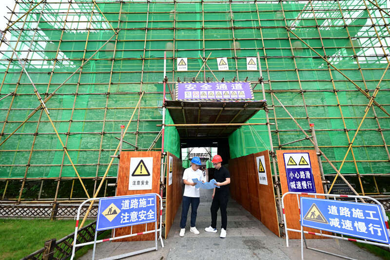 6月19日,周虎(左下)在歙县徽州古城南谯楼保养维护工程现场查看。