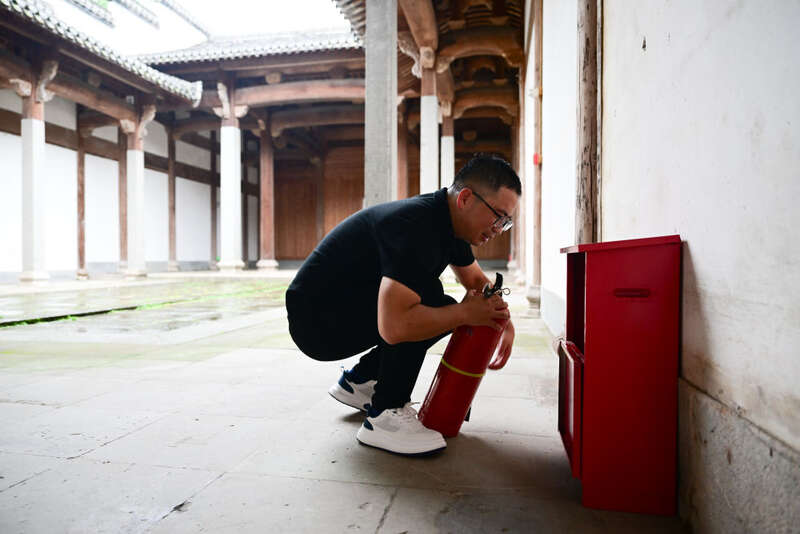6月19日,周虎在歙县一个祠堂内检查灭火器。