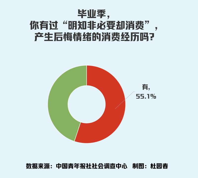 调查显示,毕业季,55.1%的受访毕业生有过“明知非必要却消费”,产生后悔情绪的消费经历。交叉分析显示,受访男生这一比例为56.0%,稍高于受访女性(54.4%)。