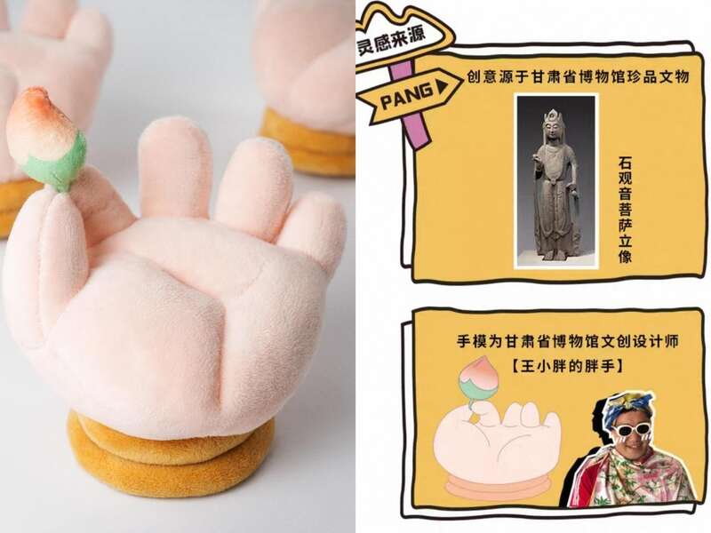 文创团队尝试开发更多“抽象”产品。比如基于绿马IP推出的黑马,表达“人人皆黑马”的励志寓意;再比如,甘肃名产黄芪成了一个扭着小屁股、举着“补气”牌子的玩偶;甚至,珍品文物石观音菩萨立像也能和团队设计师的大手融合共创,变成销量过万的文创产品“拿捏”……