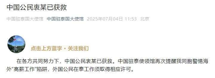 7月4日,中国驻泰国大使馆发文表示在各方共同努力下,中国公民衷某已获救。中国驻泰使领馆再次提醒我同胞警惕海外“高薪工作”陷阱,外国公民在泰工作须取得相应许可。