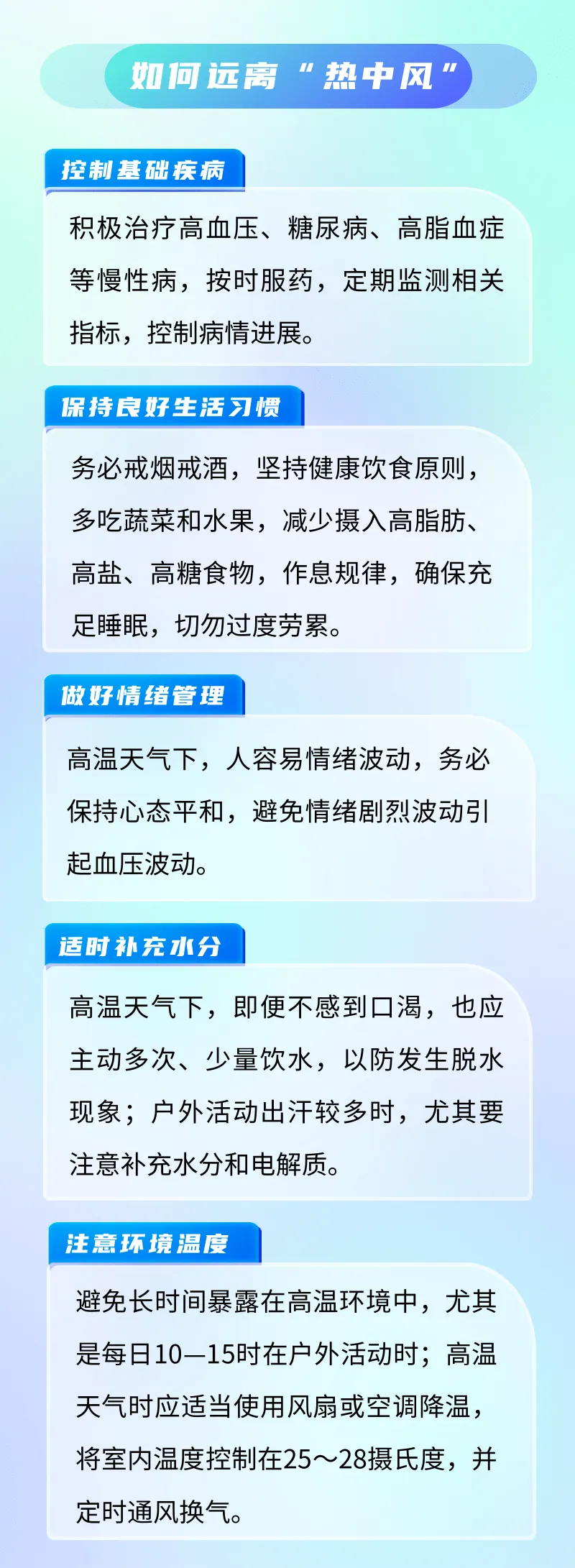 “热中风”的发生机制包括血液浓缩、血管失控及血压波动等。在炎热天气下,人体出汗增多,血管扩张明显,若水分补充不及时,容易导致血容量不足,在血液浓缩的情况下,血小板易于聚集,这会增加血栓的形成风险。而高温容易导致人心情烦躁、易怒,从而引发血压波动,也可能诱发卒中。