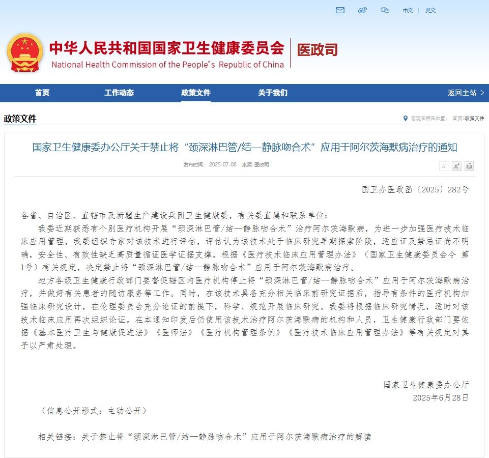 我委近期获悉有个别医疗机构开展“颈深淋巴管/结—静脉吻合术”治疗阿尔茨海默病,为进一步加强医疗技术临床应用管理,我委组织专家对该技术进行评估,评估认为该技术处于临床研究早期探索阶段,适应证及禁忌证尚不明确,安全性、有效性缺乏高质量循证医学证据支撑。根据《医疗技术临床应用管理办法》(国家卫生健康委员会令 第1号)有关规定,决定禁止将“颈深淋巴管/结—静脉吻合术”应用于阿尔茨海默病治疗。
