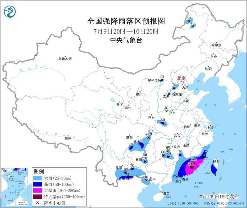 预计,7月9日20时至10日20时,福建东部和南部、广东中东部、台湾岛南部、江西南部、湖南南部、贵州中部、云南东南部、四川南部、重庆中西部、湖北西北部、河南西部、河北西部、内蒙古东部等地部分地区有大到暴雨,其中,福建南部、广东东部等地部分地区有大暴雨,局地特大暴雨(250~300毫米)。上述部分地区伴有短时强降水(最大小时降雨量30~60毫米,局地可超过80毫米),局地有雷暴大风等强对流天气。