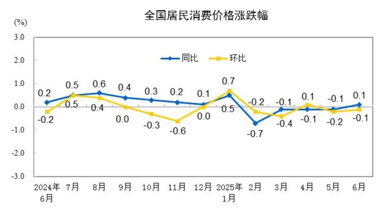 6月居民消费价格同比上涨0.1% 上半年居民消费价格比上年同期下降0.1%