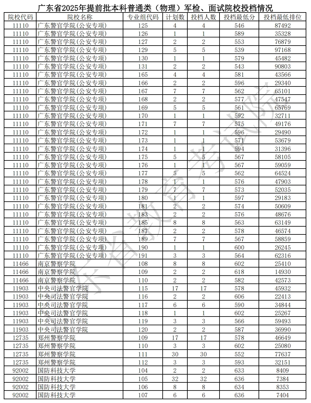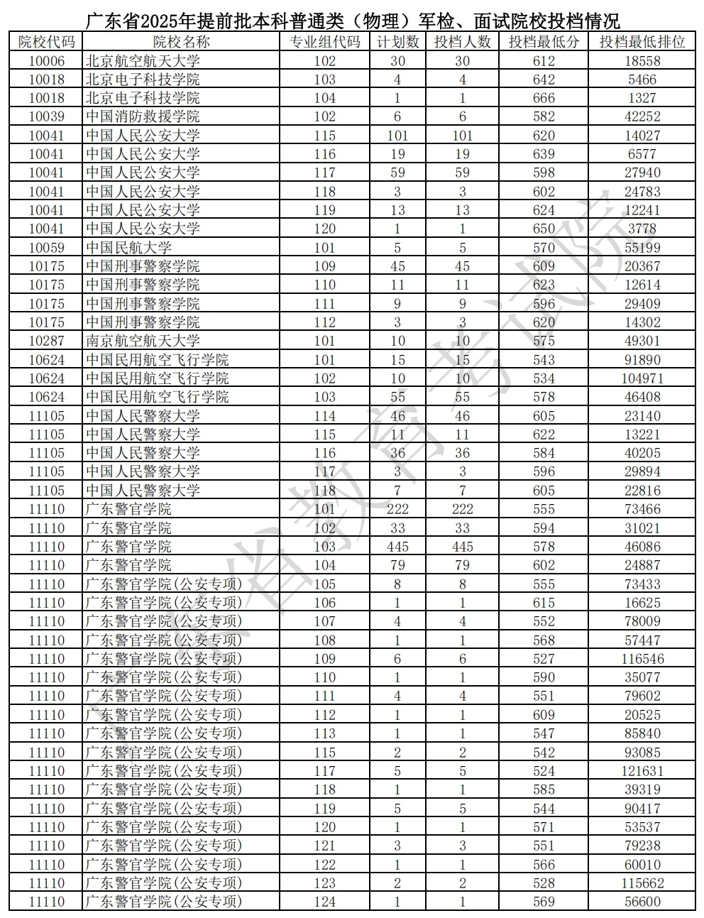 广东2025年普通高校招生录取工作已于7月8日正式开始。广东省招生办对提前批普通类空军、海军招飞和军检院校,提前批本科艺术类院校专业的“统考+校考”和本科层次戏曲类院校专业的省际联考进行了投档。