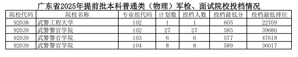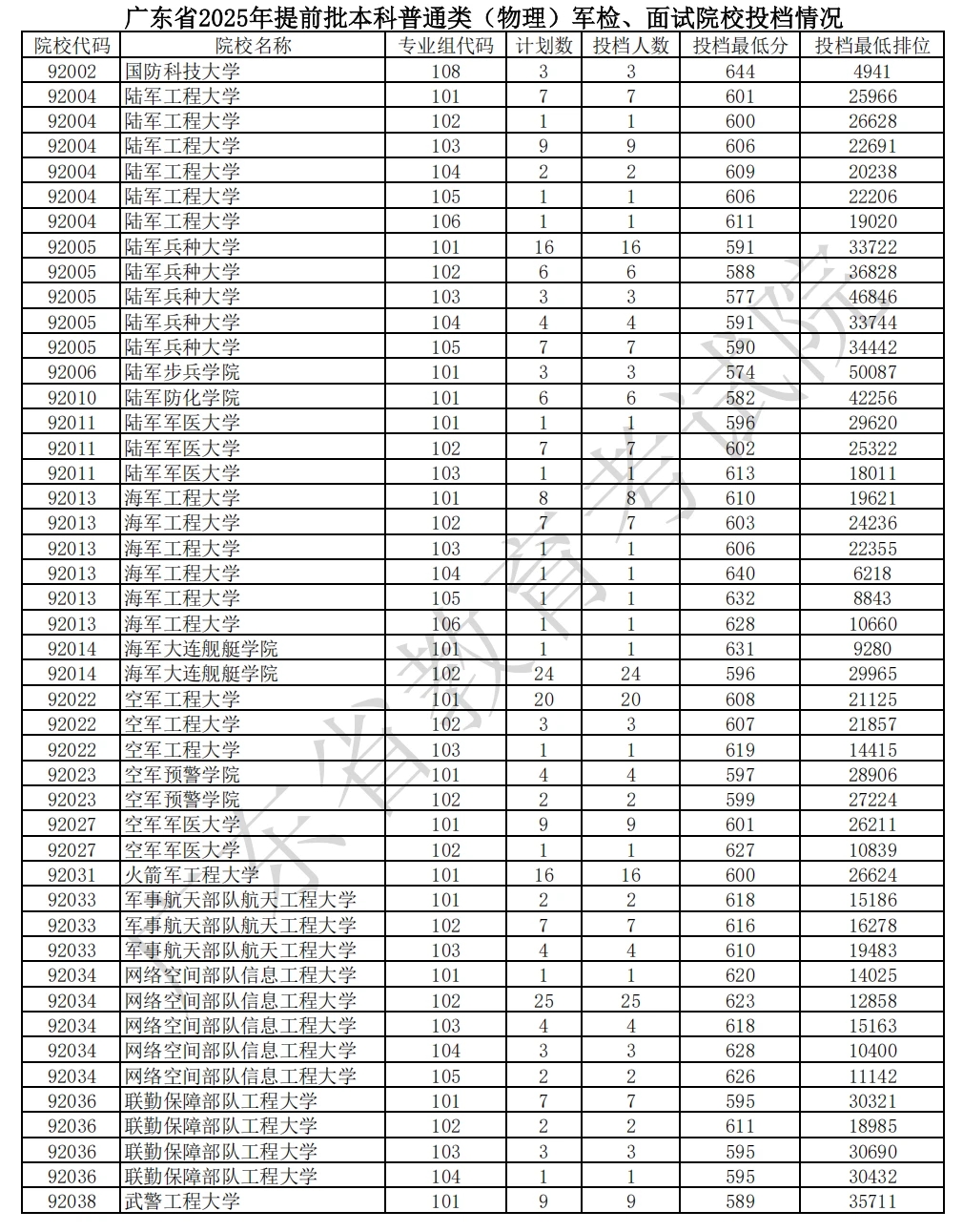 记者看到,今年历史类投档最低分中,中国人民公安大学、国防科技大学投出641分的最高分,分别是中国人民公安大学·涉外警务、国防科技大学·印度尼西亚语(军事翻译、军事外语技术初级技术军官);而在物理类投档最低分中,北京电子科技学院·电子信息工程投出666分的最高分。值得注意的是,不论是物理类还是历史类,投档最低分的最高分均出自只招女生的专业,这固然与招收女生专业的人数较少有关,但也从侧面反映出女性投身国防建设的热情高涨。此外,历史类的中国刑事警察学院、中国人民警察大学、南京警察学院,物理类的北京航空航天大学、陆军工程大学、国防科技大学等也都很受欢迎。今年新设立的中国人民解放军陆军兵种大学、中国人民解放军联勤保障部队工程大学在粤招生也都有不错的成绩,其中陆军兵种大学的录取分数线约为590分,联勤保障部队工程大学约为600分。
