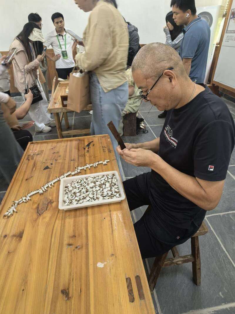 在博物馆的体验区域,几位制笔匠人正现场演示毛笔制作的各工艺环节。市级非物质文化遗产项目代表性传承人周平正咬着线的一端,两手飞快地缠绑笔头,这是制笔过程的“绑笔”环节。周平的徒弟李启富在一旁认真观看,将师父的每一个动作记在心里。