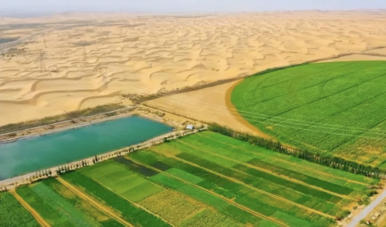 航拍视角下,一望无际的沙海边缘,处于抽穗期的玉米犹如拉开一条碧绿的防线,以挺拔的身姿阻挡住沙丘随风蔓延。