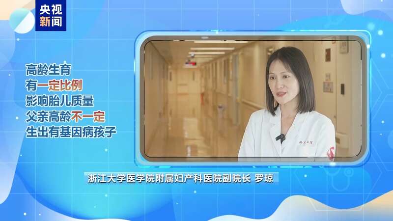 浙江大学医学院附属妇产科医院副院长 罗琼:女性的高龄主要是影响卵子的减数分裂,所以导致胎儿染色体病的概率会比较大。父亲高龄导致基因新发突变的概率会高很多。但这个只是一个比例的问题,不是说父亲高龄一定会生出有基因病的孩子。