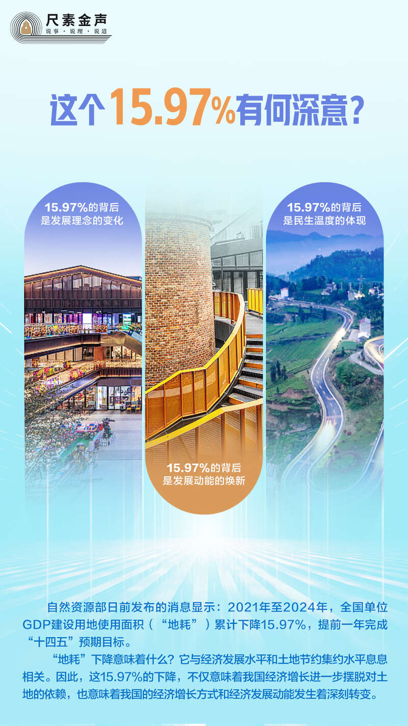 自然资源部日前发布的消息显示:2021年至2024年,全国单位GDP建设用地使用面积(“地耗”)累计下降15.97%,提前一年完成“十四五”预期目标。