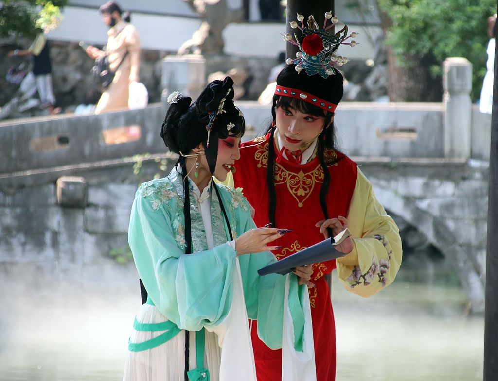 2025年7月15日,演员在苏州狮子林表演传统昆曲《石头记》。当日,苏州古典园林狮子林推出昆曲等颇具吴文化特色的旅游项目,使游客在欣赏姑苏园林美景的同时,体验吴地浓郁的地方风情,颇受中外游客的青睐。