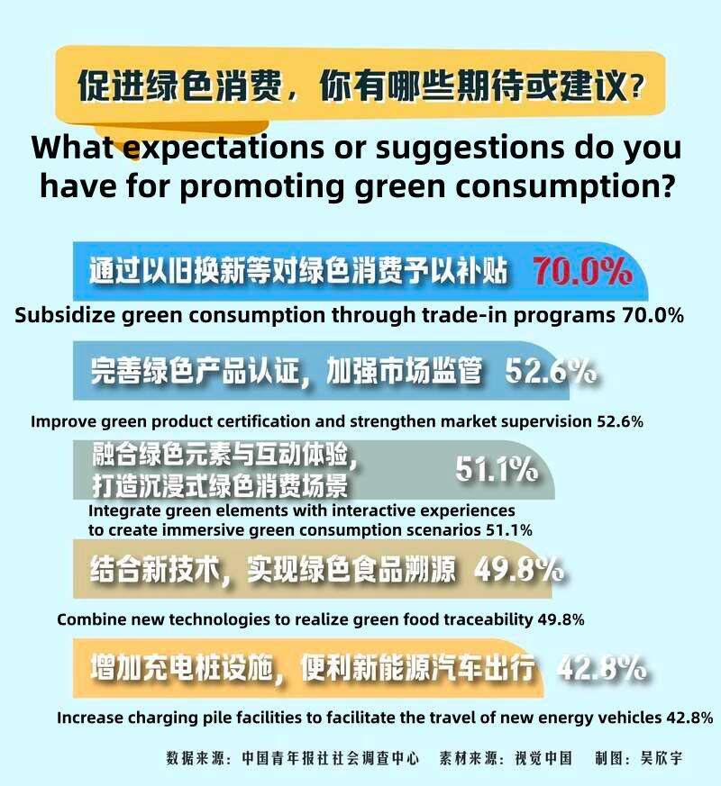 A new green consumption trend is emerging among Chinese youth, with new energy vehicles, secondhand shopping, and small-portioned orders becoming common. A survey of 1,506 young people shows 93.3% prioritize eco-friendly products, and 77.6% believe low-carbon living will spread. Key behaviors include low-carbon travel and buying green food. Young people favor these for safety, health, and environmental benefits. They also suggest subsidies and better certifications to boost green consumption, with some sharing their own eco-friendly practices.(Data source/ Social Survey Center ofChina Youth Daily)