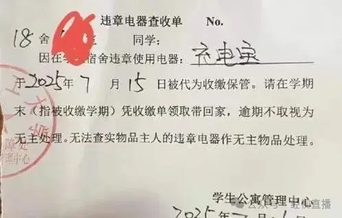 徐汇校区学生爱音(化名)表示,有学生收到了“违章电器查收单”,显示学生“因在学生宿舍违章使用电器充电宝,于2025年7月15日被代为收缴保管。”该查收单落款单位为学生公寓管理中心,落款时间为2025年7月15日。