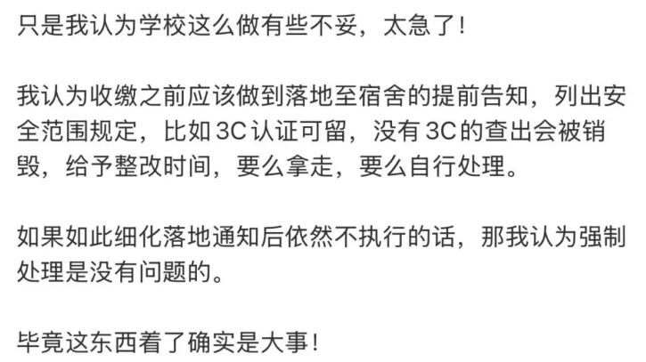 此外,国家并未发文明确指出充电宝属于违规电器,仅规定不能携带无3C认证的充电宝乘坐飞机。学校对所有充电宝一律收缴,这种做法属于“一刀切”,“程序上也不太合法”。