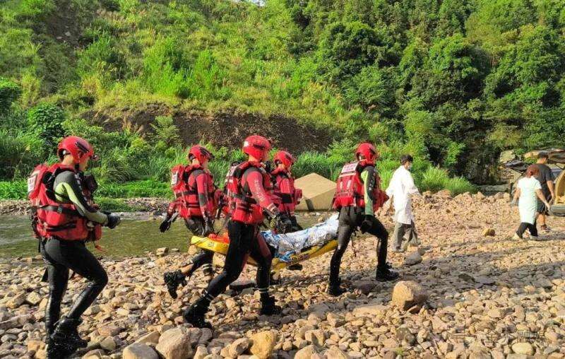 经过20分钟紧张搜救,消防救援人员终于在距终点约3公里处峡谷河段发现昏迷“驴友”。
