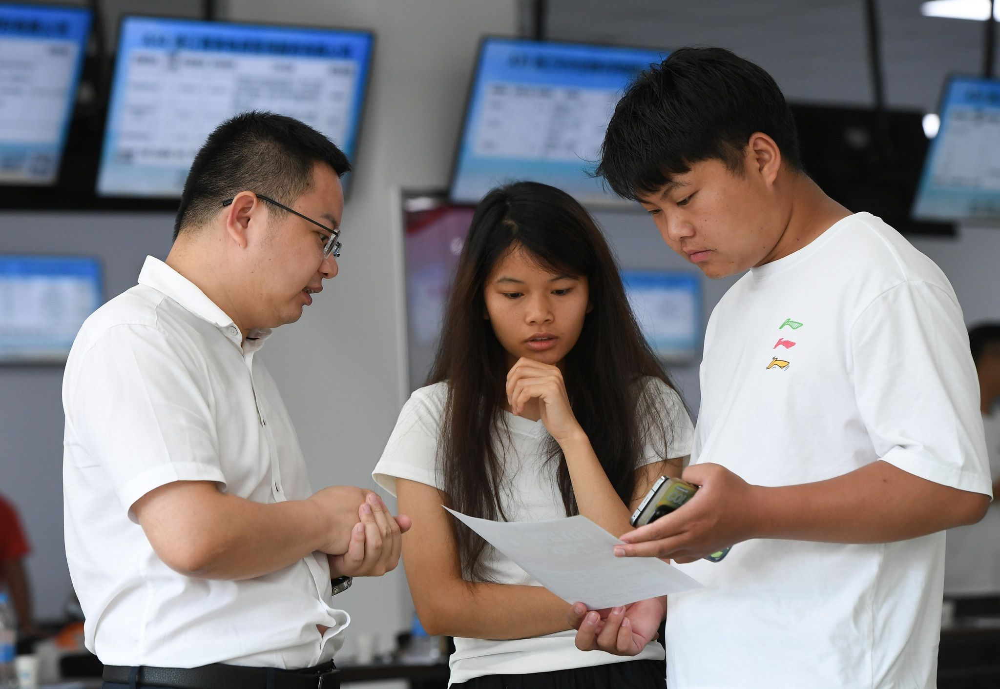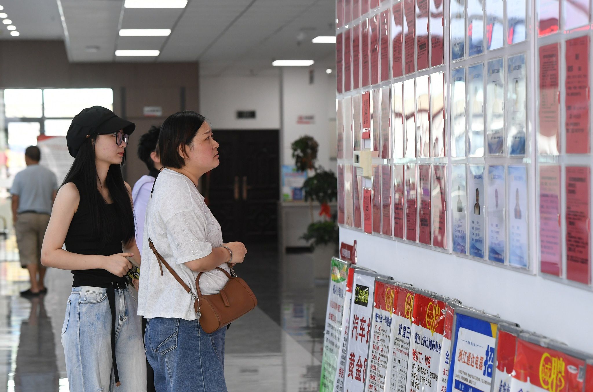 2025年7月18日,浙江省金华市婺城零工服务中心暑期专场招聘会上,求职者了解岗位信息。
