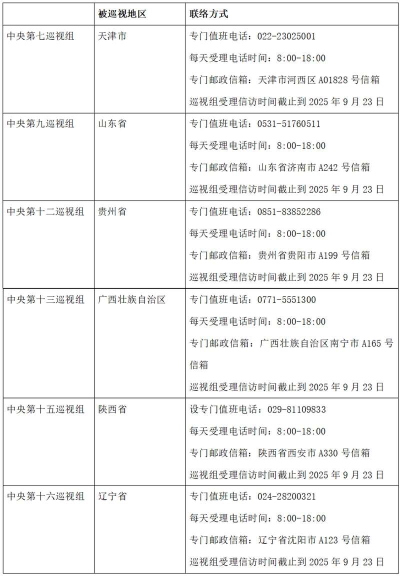 根据党中央关于巡视工作的统一部署,近日,二十届中央第六轮巡视的16个巡视组陆续开始进驻被巡视地区,并公布了联系方式。
