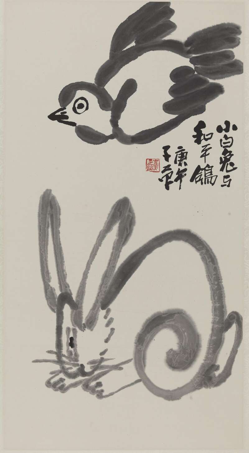 《小白兔与和平鸽》 崔子范 中国画 89×48cm 1990 中国美术馆藏