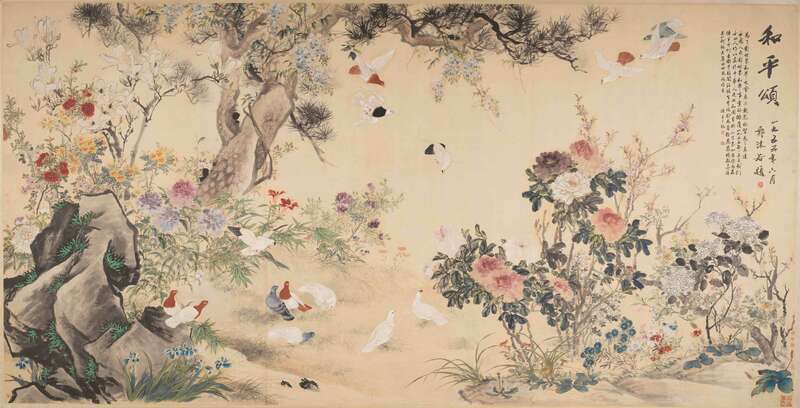 《和平颂》 齐白石、陈半丁、何香凝、于非闇、汪慎生、李瑞龄、马晋、徐燕荪、杨敏、王雪涛、吴一舸、张其翼、田世光、段履青画;陈半丁题词;郭沫若题 中国画 200×396.5cm 1955 中国人民对外友好协会藏
