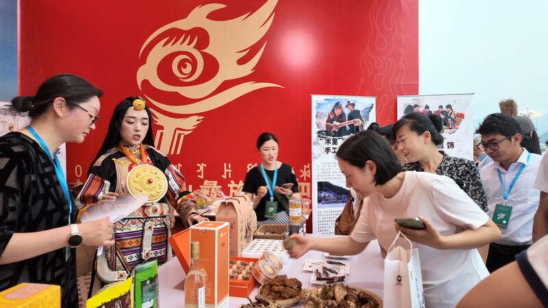 凉山州木里藏族自治县的非遗集市上,工作人员向游客介绍产品。中青报·中青网记者 陈晓/摄
